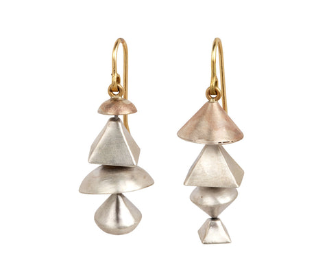 Four geometric tiers of modern, mobile-like and sculptural shapes give these Judy Geib earrings their style-defining presence. Each of the hand-fabricated sterling silver components stacks on top of the next to create two intentionally mismatched earrings. Eclectic, sophisticated and utterly fabulous, they are perfect worn both casually and dressed up.