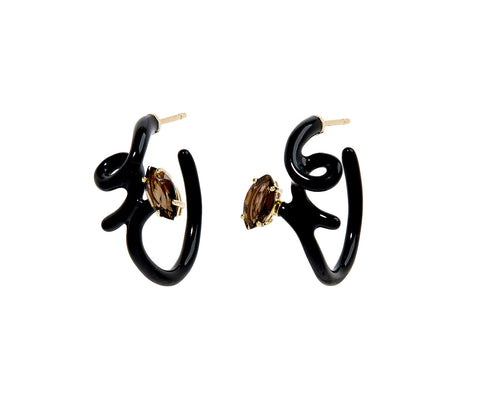 With a hint of sparkle, these Bea Bongiasca earrings are the perfect addition to any casual, look. The sterling silver vine hoops are covered in a layer of black enamel. Marquise cut smoky quartz are set in 9K yellow gold prongs in the center of the vines. The earrings connect to 9K yellow gold post backs.