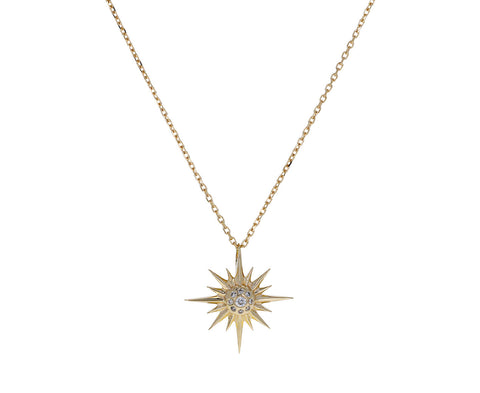With just a hint of sparkle, this Celine Daoust pendant necklace has a sweetly symbolic style. The 14K yellow gold pointed sun pendant has been set with a center of tiny shimmering diamonds and polished gold rays. It hangs from the center of the 14K yellow gold chain and looks stunning whether worn alone or layered with your other favorites.
