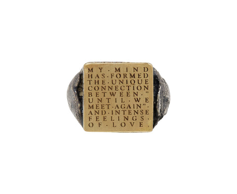 With its hand carved texture and combination of materials, this Tó Garal signet ring is an earthy, edgy take on the traditional signet ring. The matte 18K yellow gold ring face is set over oxidized sterling silver at the center of the oxidized sterling silver band. Engraved on the front is a sweet, symbolic love story.