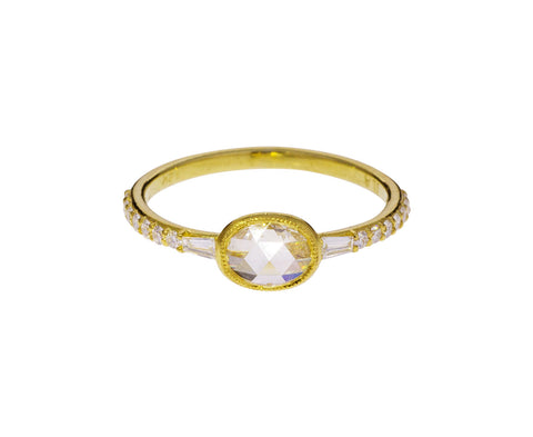 With its captivating presence and balance of traditional and modern, this Ila diamond solitaire is the perfect way to symbolize an engagement. The oval rose cut diamond is set in 14K recycled yellow gold and framed on each side by a tapered baguette and round diamonds.