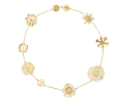 Whimsical and elegant, this Judy Geib necklace is an artistic balance of shape and space. Graceful loops and flowery geometry create airy floral shapes composed of 18K yellow gold. Meticulously hand-crafted, each link is connected by strands of 18K yellow gold chain. Fluid and sophisticated, this necklace is most certainly a piece of wearable art.