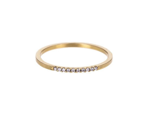 With its stunning simplicity and minimal, modern elegance, this Tura Sugden ring possesses just a whisper of sparkle. The square-edged 18K yellow gold band is set with ten shimmering diamond across its front surface. Perfect as a symbol for a wedding, anniversary or special occasion. Pair it with one of her diamond solitaires for a quietly elegant wedding set.