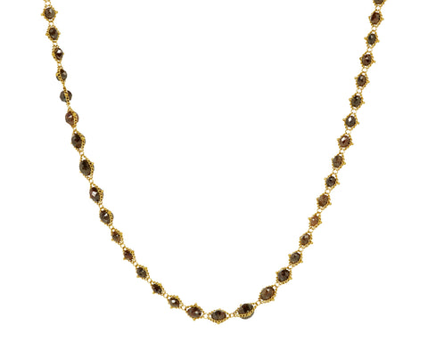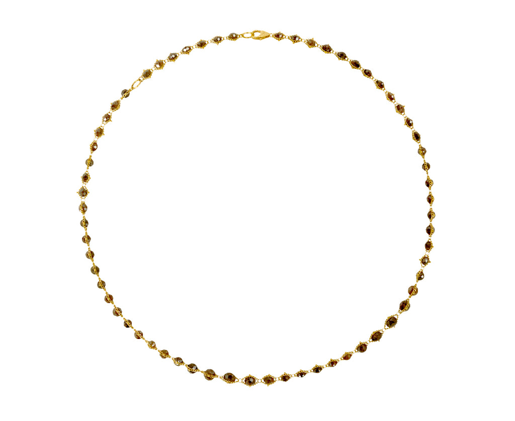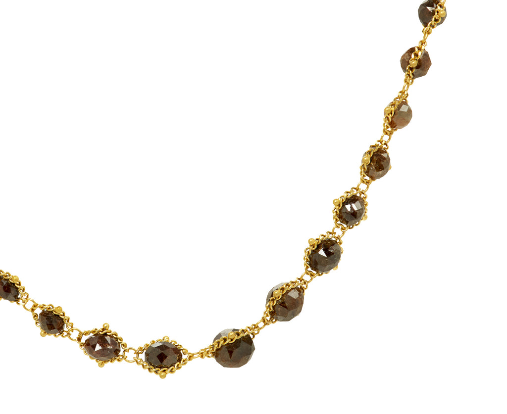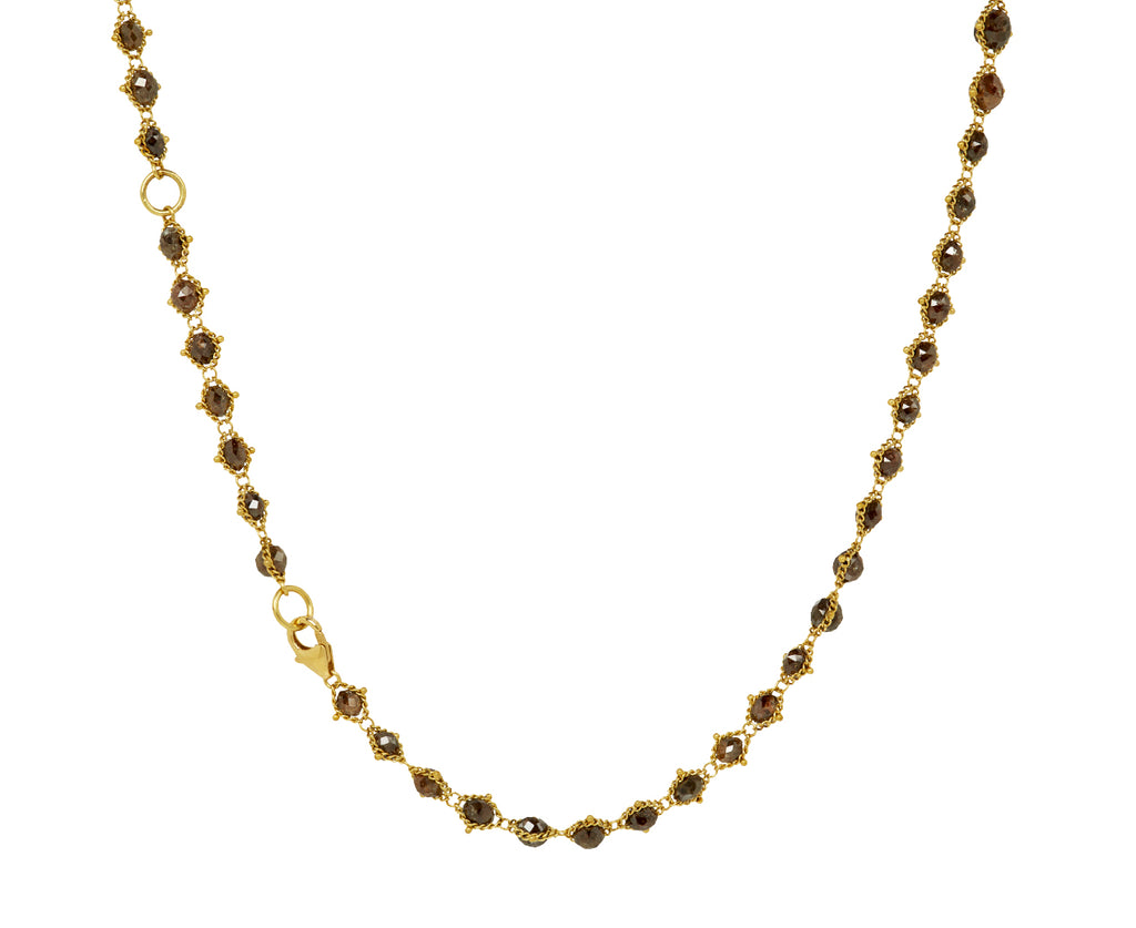 With its fluid form and versatile color story, this Amali necklace can make its way into any look you create. The faceted beads of brown rustic diamonds are woven into the 18K yellow gold chain setting which weave together to create the single strand. Alone or layered with your other favorites, it adds a modern, classic vibe to any collection.