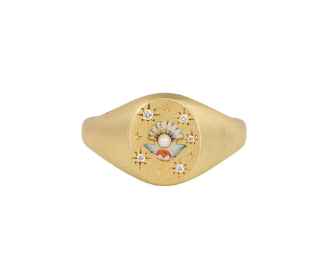 With its stunning details and subtle sparkle, this Cece Jewelry ring is a sweetly feminine take on the traditional signet ring. The matte 18K yellow gold oval ring face has been delicately painted with a tiny Champlevé enamel clam shell and set with five tiny star set diamonds. A small white pearl sits at the center of the clam adding the perfect touch of whimsy. The composition is set at the center of the matte 18K yellow gold band.