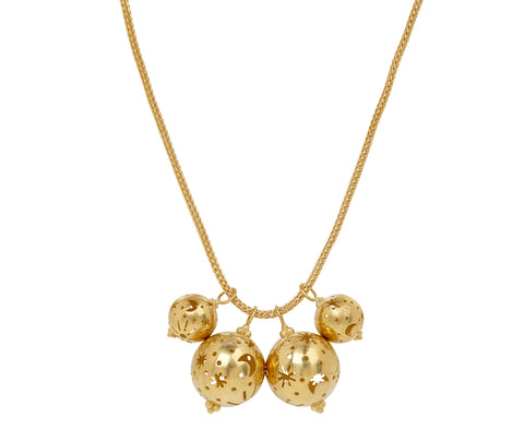 Offering protection and positive energy with every delicate chime, this Pari necklace has an earthy sophistication. The four round, 18K yellow gold charms vary in size and have tiny, celestial cutouts, allowing the soft chime to ring through. They hang clustered together from the fluid 14K yellow gold chain.