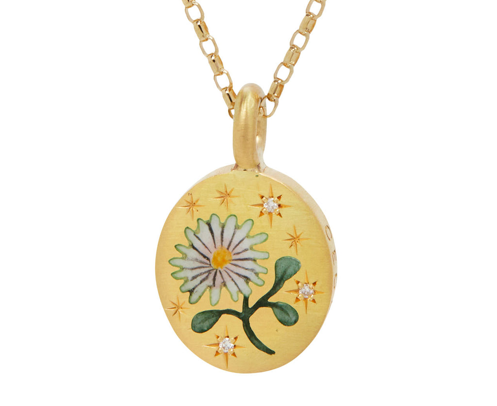 Sweet and simple, this Cece Jewelry necklace will add a hint of feminine vibe to any collection. The matte 18K yellow gold oval pendant has a wild, white daisy depicted in Champlevé enamel and set with three tiny star set diamonds. It hangs from the adjustable 18K yellow gold chain and looks perfect whether worn alone or layered with your other favorites.