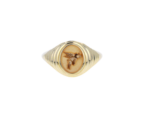 Exuding a bold, style defining vibe, Retrouvai has created a modern take on the traditional signet ring. The 14K yellow gold signet ring showcases a dimensional flying pig and is is engraved on the inside with the message "anything is possible". It is centered on the tiered 14K yellow gold band, creating a ring that is both classic and modern.