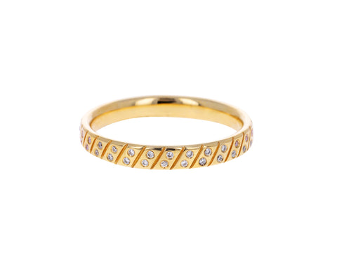 With a hint of sparkle and understated geometric design, this Artemer band is the perfect way to symbolize a wedding, anniversary or special occasion. The 18K yellow gold ring is covered in tiny lines engraved at an angle and set with duos of tiny round diamonds (E-G / VS). A modern classic.