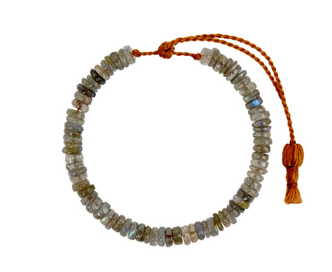 With its earthy, effortless vibe, this collection of smooth garnet beads create a stunning, casual Lena Skadegard bracelet. Each of the iridescent labradorite stones is knotted along the adjustable nylon cord. Alone or nestled into a layered collection of your favorite bracelets, its versatility makes it an easy choice for wearing daily.