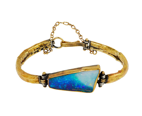 This earthy, vibrant Judy Geib bracelet is all about the stunning natural color and characteristics of the trapezoidal opal. The smooth opal has striking marbling of vibrant periwinkle and white swirls. It is framed in 18K yellow gold and backed in sterling silver with a gold star set in its center. It attaches to the hinged segments of sterling silver covered in a layer of hammered 22K yellow gold. It fastens with a hook and eye closure with a safety chain.