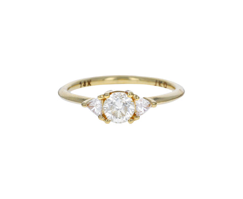 This delicate Jennie Kwon diamond solitaire is the perfect way to symbolize an engagement. The sparkling center stone - a round, brilliant cut diamond - is set in 14K yellow gold prongs. Trillion cut diamonds are set on each side to complete the traditionally inspired design. Pair this with a Jennie Kwon band and your set is complete!