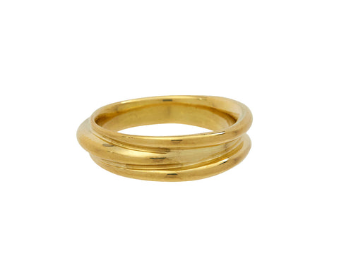 With its earthy, asymmetrical design and rich, warm toned gold, this Ten Thousand Things band exudes a timeless sophistication. The polished, buttery 18K yellow gold band has a three-tiered surface that sticks out in opposite directions and widens slightly along the finger. It is a modern, elegant alternative to the traditional band.