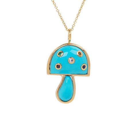 Inspired by the playful magic of make-believe worlds, this Brent Neale necklace exudes a bold presence and pop of color. The bright turquoise mushroom is set on a frame of 18K yellow gold and set with one shimmering diamond, one emerald, one citrine and two blue sapphires. The pendant hangs from the center of the 18K yellow gold chain which fastens with a lobster closure. Perfect alone, it also adds a cheeky vibe to a layered necklace look.