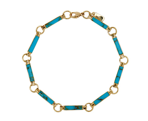 With its vibrant color and one-of-a-kind characteristics, this Foundrae bracelet looks perfect alone or layered with your other favorites. The continuous strand is composed of links made up of polished 18K yellow and bright blue turquoise. It closes with an 18K yellow gold lobster clasp.