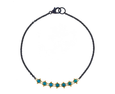 Combining the understated luxe of oxidized sterling silver with vibrant turquoise beads, Amali has created a stunning bracelet with effortless elegance. Stationed in the center of the bracelet is a segment of smooth turquoise globes meticulously hand-woven into 18K gold. Worn alone or as an addition to a layered collection, it adds a casual sophistication to your look.