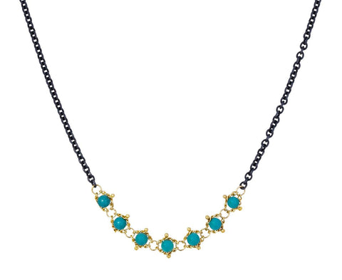 Drawing inspiration from the rich texture and subtle movement of fabric and textiles, this Amali necklace possess a fluid, effortless elegance. Smooth globes of vibrant turquoise are meticulously hand-woven into 18K yellow gold to create a short station along the base of the neck. The station attaches to two lengths of oxidized sterling silver creating a casual-yet-sophisticated layering piece.