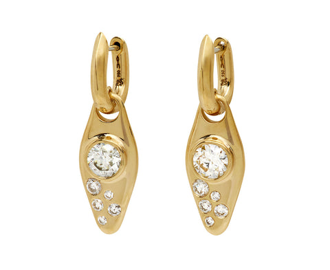 Modern and statement-making, these Uniform Object earrings have their signature vessel design front and center. The 18K yellow gold huggie hoops connect to 18K yellow gold latch backs. Dangling freely from the hoops are polished 18K yellow gold vessels, set with a surface of scattered large, round white diamonds. Perfect for everyday for the person with an edgy sense of style.