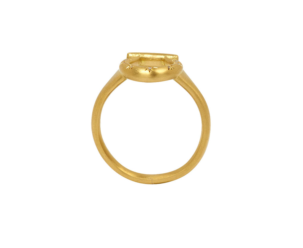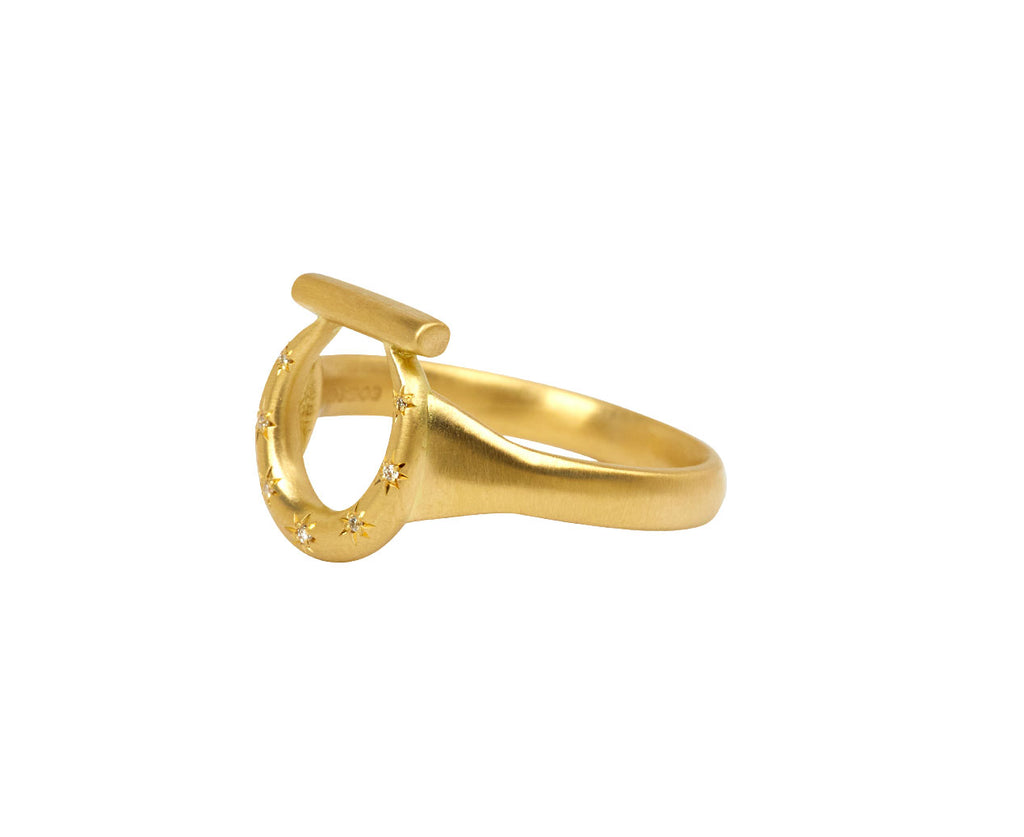 With its vintage inspired, statement-making design, this Cece Jewelry ring looks perfect on any finger. The matte, 18K yellow gold horseclip is set with round, white diamonds and is centered on the matte 18K yellow gold band.