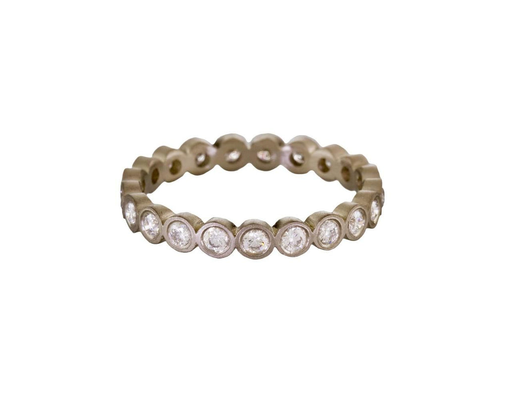 Around and around, completing a full circle, these sparkling diamonds symbolize eternity in this Mandrel Studio band. Each of the brilliant cut white diamonds is framed in a bezel of 18K white gold. They connect to form the continuous band which pairs perfectly with a Mandrel Studio diamond solitaire, a stacking collection or worn solo.