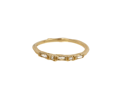 With its subtle sparkle and minimal design, this Ellis Mhairi Cameron band offers a modern alternative to the traditional wedding band. Three sparkling baguette diamonds are broken up by two round shimmering diamonds across the front surface of the 14K gold band. Alone, added to a stacking collection, or paired with one of her solitaires, it exudes a stunning, restrained style.